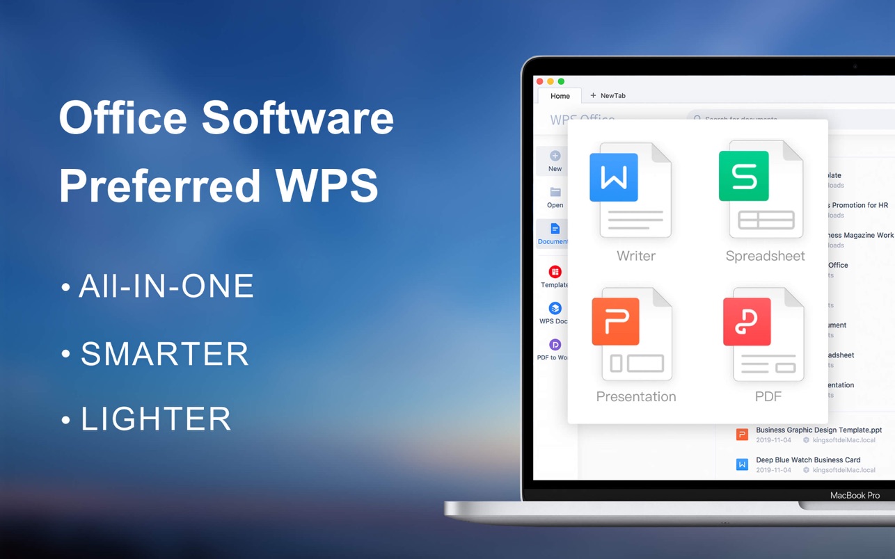 يتميز WPS Office بأنه مجموعة مكتبية مجانية وخفيفة الوزن وشاملة على نظام macOS ، وهو يدمج جميع وظائف معالج النصوص في المكتب: Word و PDF و Presentation و Spreadsheet و Cloud and Cooperative Service في تطبيق واحد مع تصميم واجهة مستخدم فريد وبديهي.